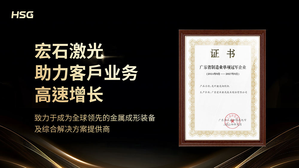 宏石激光自2006始創(chuàng)至今,已榮獲國家高新技術(shù)企業(yè)、國家知識產(chǎn)權(quán)優(yōu)勢企業(yè)獎、行業(yè)創(chuàng)新大獎等多項國家和行業(yè)榮譽。此次獲評“廣東省制造業(yè)單項冠軍企業(yè)”,是對宏石激光堅實技術(shù)實力、良好產(chǎn)品品質(zhì)與強勁市場競爭力的高度認可。宏石激光堅持以助力客戶業(yè)務高速增長為品牌使命,一直不遺余力地通過優(yōu)質(zhì)產(chǎn)品、先進服務等推動中國制造實現(xiàn)智能化轉(zhuǎn)型,致力于成為全球領(lǐng)先的金屬成形裝備及綜合解決方案提供商。
